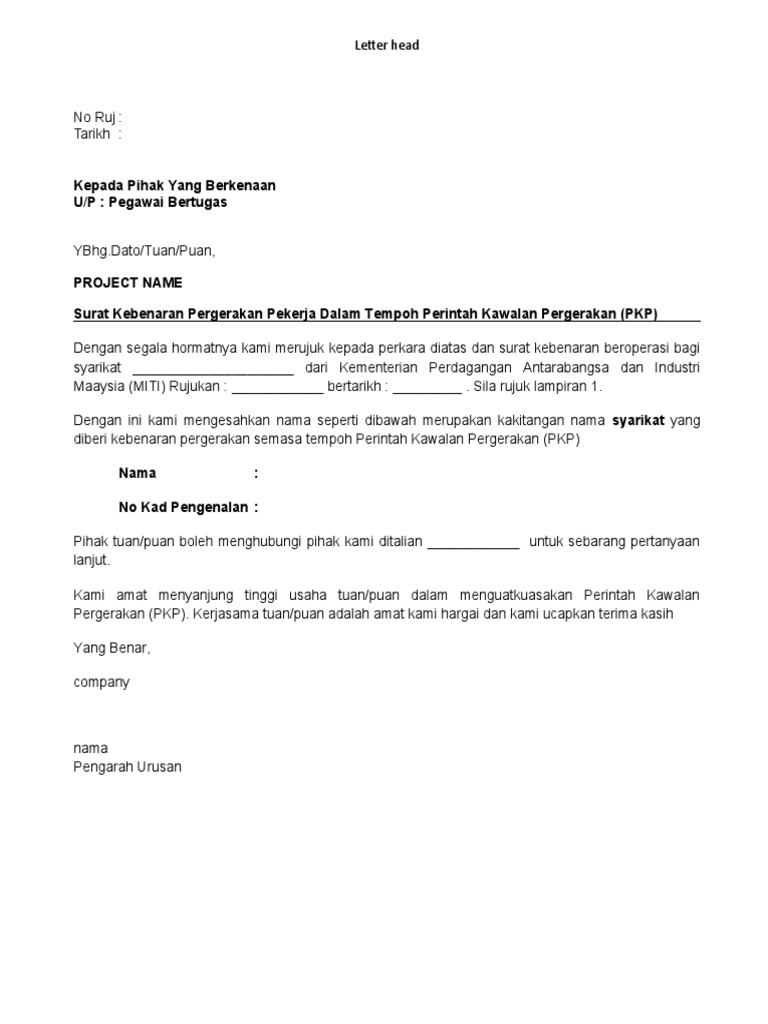 Kami memohon jasa baik TuanPuan untuk memberi kebenaran kepada syarikat dan pekerja yang dinyatakan dalam surat ini untuk meneruskan perjalanan dan melaksanakan tugas rasmi beliau bagi tujuan yang dinyatakan di atas. Contoh surat kebenaran bekerja pkp pkpb pelepasan perjalanan mei 20 2021. Anda juga boleh memuat turun permit pergerakan merentas daerah atau negeri yang dihebahkan oleh PDRM.