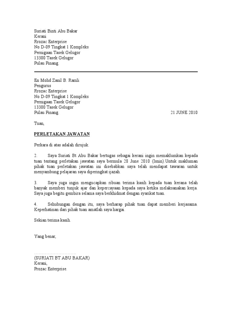 The collection that consisting of chosen picture and the best amongst others. Antaranya ialah surat letak jawatan 24 jam letak jawatan dalam masa 30 hari dan sebagainya. Contoh Surat Berhenti Kerja Sambung Belajar Contoh Surat.