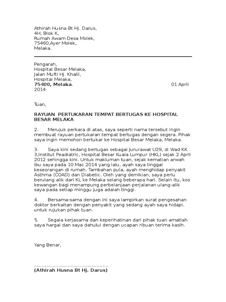 Contoh surat rayuan pertukaran tempat kerja jururawat. Newer Post Older Post. Contoh Surat Rayuan Pertukaran Tempat Kerja Jururawat. Resepi Ikan Masak Western.