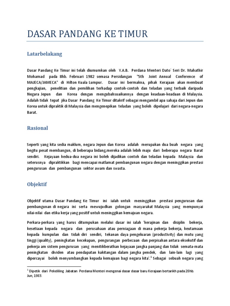 Dasar pandang ke timur yang diamalkan malaysia. Dasar awam boleh didefinisikan sebagai arah umum yang ingin dituju oleh kerajaan berkaitan dengan masalah tertentu. Langkah Malaysia untuk mengukuhkan gelombang kedua Dasar Pandang ke Timur yang memberi tumpuan kepada teknologi tinggi dan pekerja berkemahiran tinggi akan membantu ekonomi meningkatkan rantaian nilai dan seterusnya kepada status berpendapatan tinggi kata Perdana Menteri Datuk Seri Najib Tun Razak. Ketika itu Dr Mahathir baru menjadi Perdana Menteri Malaysia 1981.