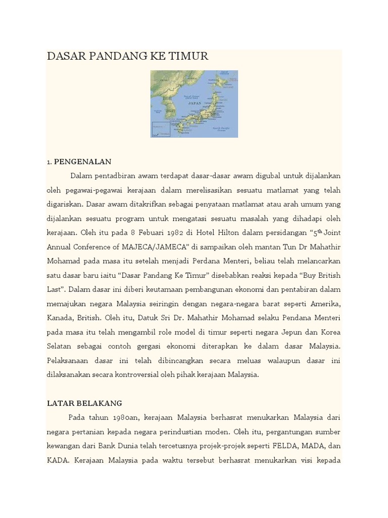 Walaupun dalam Dasar Pandang ke Timur melihat kepada negara seperti Jepun Korea Selatan Taiwan dan Singapura tetapi tumpuan lebih kepada JepunDasar yang diperkenalkan pada 1982 sangat relevan dengan Malaysia dan telah membantu Malaysia terus maju dan wajar diteruskan. Sebagai rakyat Malaysia Dasar Pandang Ke Timur yang disarankan oleh Tun Dr. I- kepimpinan polotik serantau.