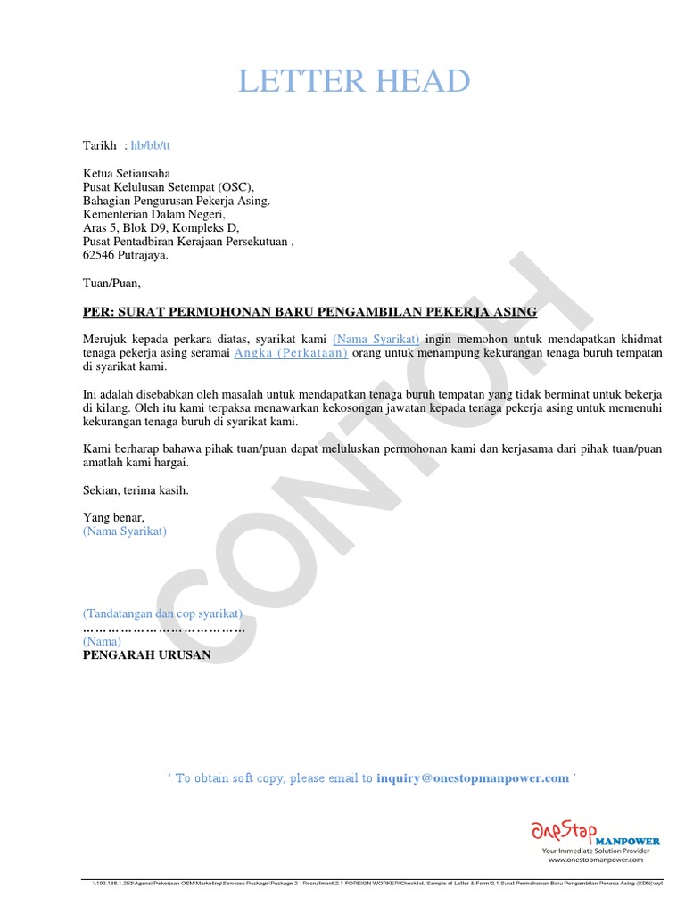 Contoh Surat Rasmi Permohonan Pekerja Asing Savitdru